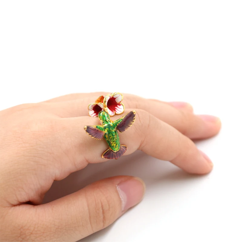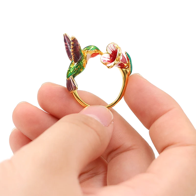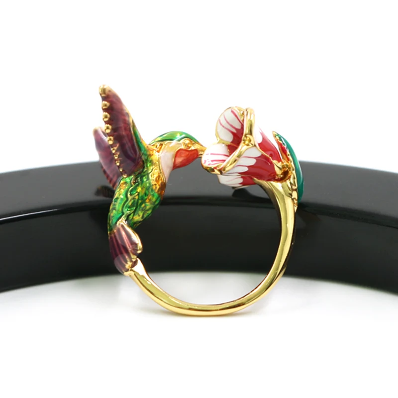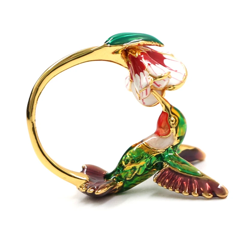 エナメルの職人技における長い専門知識のおかげで、エナメル質は金メッキのエナメル花の金属パターンに完璧に満たされています - 鳥の真鍮リング。表面は滑らかで平らで、自然な色の遷移があります。金属製の彫刻と研磨のプロセス中、私たちの熟練した職人は、すべてのラインが滑らかで優雅で、リングにユニークなテクスチャーを与えていることを保証します。